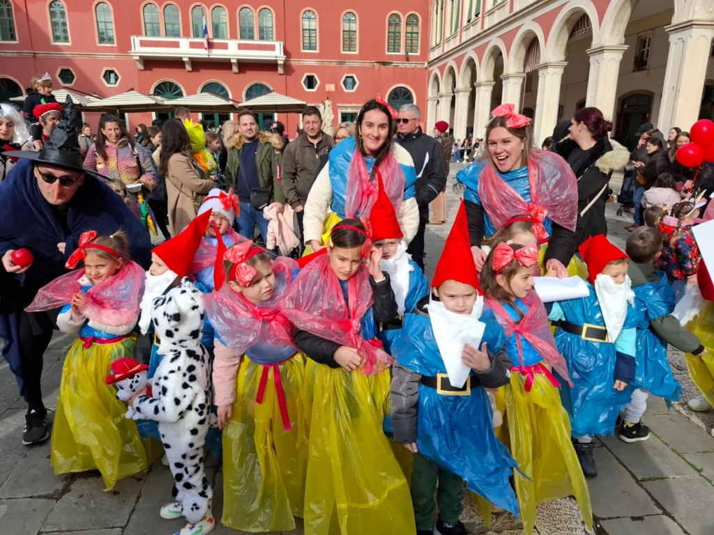 Središnji dio zabave bio je na Prokurativama, gdje je održan prigodan zabavni program za male i velike maškare. Organiziran je izbor najboljih maski u više kategorija, animacijski program za djecu te druženje uz glazbu i predstavljanje regionalnih karnevalskih skupina. Vrtićka skupina iz DV Frulica osvojila je prvo mjesto za najbolju grupnu masku koja se zvala “Priče i bajke za djecu”. Nagradu im je uručio gradonačelnik Tomislav Šuta. Šarenilo kostima, maštovite kreacije i razigrani nastupi ispunili su smotru veseljem i smijehom, pokazujući koliko je ova manifestacija važna najmlađim sugrađanima. U nastavku je održana povorka regionalnih karnevalskih skupina, koje su publici predstavile bogatstvo tradicije, humora i kreativnosti, unoseći dodatnu energiju i karnevalski šušur u središte grada.