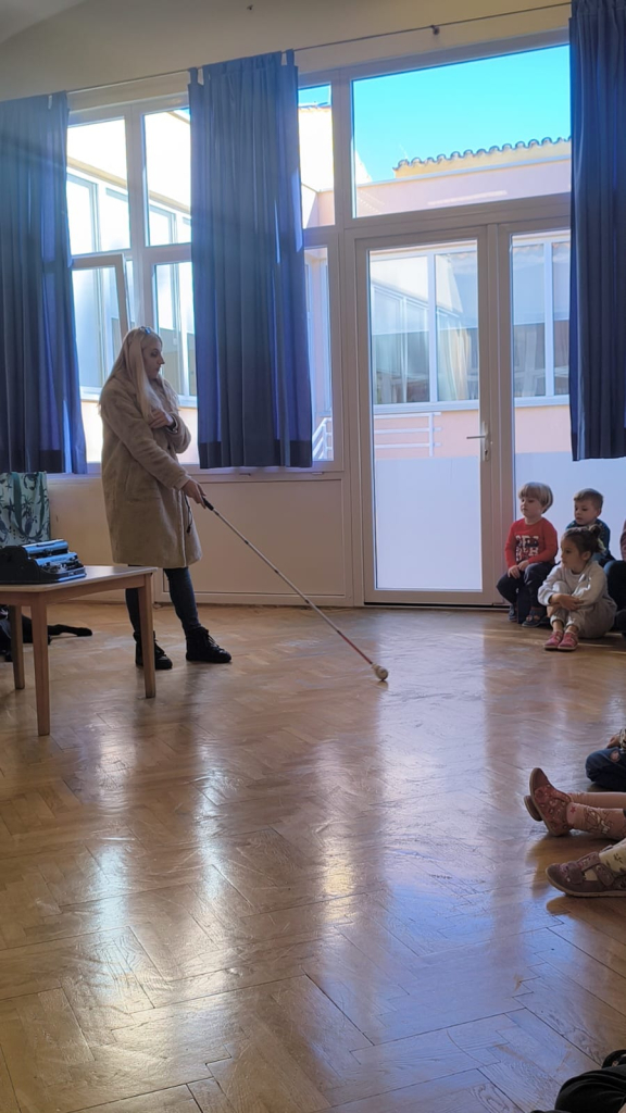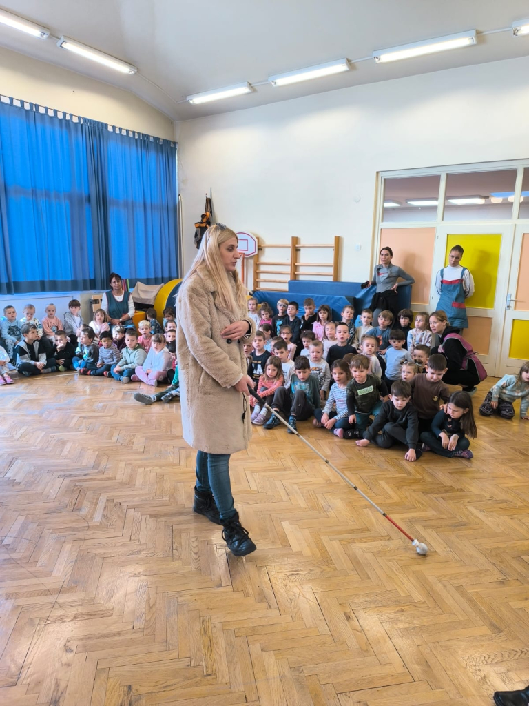 Djeca su se kroz razne aktivnosti upoznala sa životom slijepih osoba: kako pomoći slijepoj osobi, kako one vide, što im pomaže u svakodnevnom životu (bijeli štap, pas vodič), što koriste za pisanje i čitanje, kako im izgledaju knjige i slično.